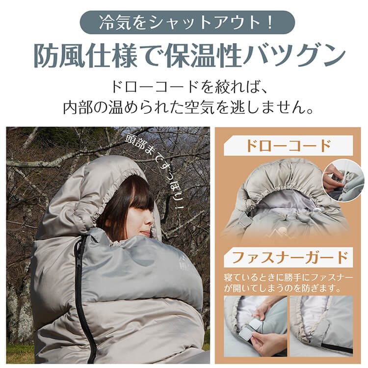 ■ドローコードとファスナーガードで内部の温められた空気を逃がさず保温性抜群です。