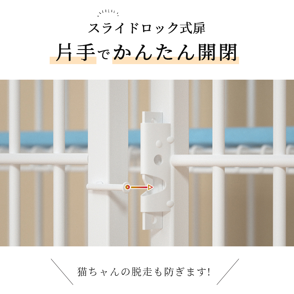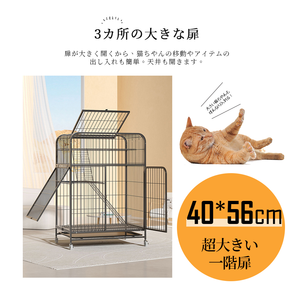 ネコの飼育に十分適した余裕のあるケージです。移動や掃除するのに便利なキャスター付き。ペットや物の出し入れが簡単です。