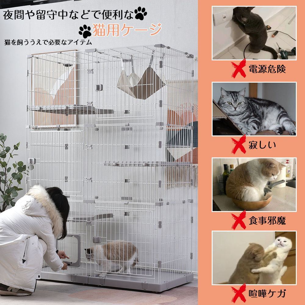 ・素材 スチール ・カラー ホワイト、ピンク、グレー ・商品サイズ 125*62*184.5cm ・梱包数 1 ・梱包サイズ 63.7*32.4*66.4cm ・重量(N.W.) 27.37kg ・重量(G.W.) 28.87kg ・生産国 中国 ・組立品/完成品 組立品 ・耐荷重 24kg Features この商品について: ◎01 こんな時に大活躍キャットケージ ◎02 幅広設計 ◎03 自由に組み合わせられる ◎04 錆びにくい塗料 ◎05つまみタイプのドア ◎06広い棚板 ◎07猫ドア付き ◎08ハンモック付き ◎09一段と二段タイプとしても使用可能 商品の説明: ◆01こんな時に大活躍キャットケージ 1出かける時 お留守番時に、子猫の安全を守る 2多頭飼いの時 けんか防止用。最初の仲悪い時期にネコたちを分離して冷静にする。 3猫の運動不足を解消したい時 二段と三段のケージで上下運動できます。 4ネコちゃんが病気になる時 世話しやすい構造。他の子とも距離を保つ。 5お料理中やお食事中 いたずら防止やテーブルに上がるのを防止… ◆02幅広設計 広々としたスペースで窮屈しない ◆03自由に組み合わせられる 自由に組み合わせられるので、ニャンコのお城を作ってみよう! ◆04錆びにくい塗料 錆びにくいエポキシ樹脂塗料 耐食性、耐摩耗性に優れていて、末永くお使いいただけます。 ◆05つまみタイプのドア つまみタイプのドアがいたずらしにくい 全ての段に扉がついているので、ニャンコや物の出し入れが簡単です。 ◆06広い棚板 広い棚板でのびのびリラックス 広々とした棚板があり、猫ちゃんがのんびりリラックスできます。 サイズが十分あるので、棚板に猫ベッドやおもちゃなども置ける。 ケージから棚板を出すことも非常に簡単で、掃除しやすいです。 ◆07猫ドア付き 自由に出入りができる猫ドアが付きで、ケージをリラックスして過ごせる場所になります。飼い主の都合によって、外からロックすることもできます。 ◆08ハンモック付き 贅沢なハンモックでニャンコがゆったりリラックスできます。 ◆09一段と二段タイプとしても使用可能 子猫一匹は一段、大きくなってきたら、家族が増えたら、新しいネコちゃんを迎えることになったら、二段または三段に増築し、楽しくアレンジできます! Attention ご注意: ※お客様組み立て品となります。 ※本商品の組み立てやご使用に際しては、乱暴に扱いますと損害やケガの原因となりますので、丁寧にお取り扱いください。 ※商品デザインは、品質に差し支えない程度に、予告なく変更する場合があります。 ※新しく入荷した商品は今まで販売していた商品と色差がある場合がございます。 ※商品のデザインが写真と違う場合がございますが品質上の問題なく使えますのでご了承下さい。 ※必ず水平で、安定した場所に設置してください。 ※運送途中に損害をもたらす可能があり、ご心配なく気軽に弊社とご連絡ください。 ※大型商品ですので、開梱後のお客様都合による、ご返品を承る事が出来かねます。